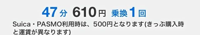 PASMOやSuicaだと、500円になるらしい。最安値ルートかつ、早い。
